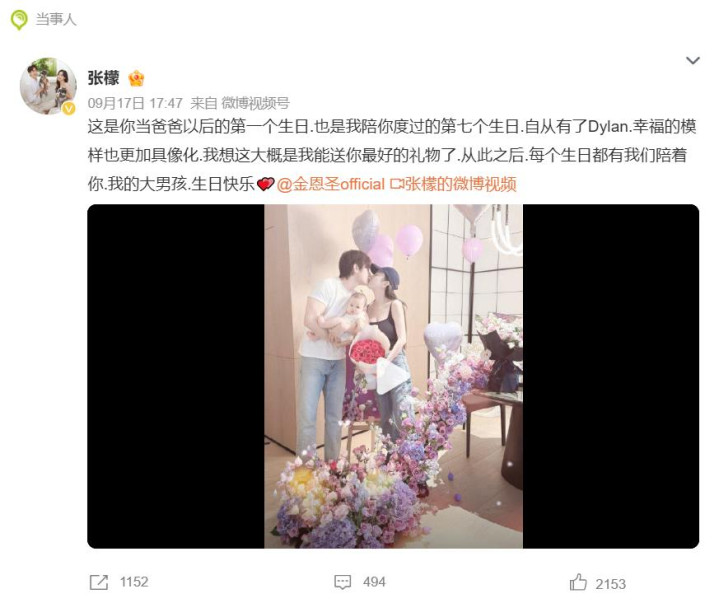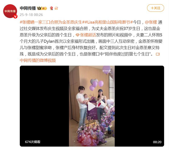 9月17日,张檬在社交媒体上发布了一组温馨全家福和庆生视频,为丈夫金恩圣庆祝37岁生日。但这次生日不同于往年——这是金恩圣升级为爸爸后的第一个生日。视频中,夫妻俩怀抱5个月大的儿子Dylan亲密出镜,画面中金恩圣小心翼翼搂着宝宝,与张檬甜蜜亲吻,一家三口互动爱意满满,张檬产后状态也十分亮眼。